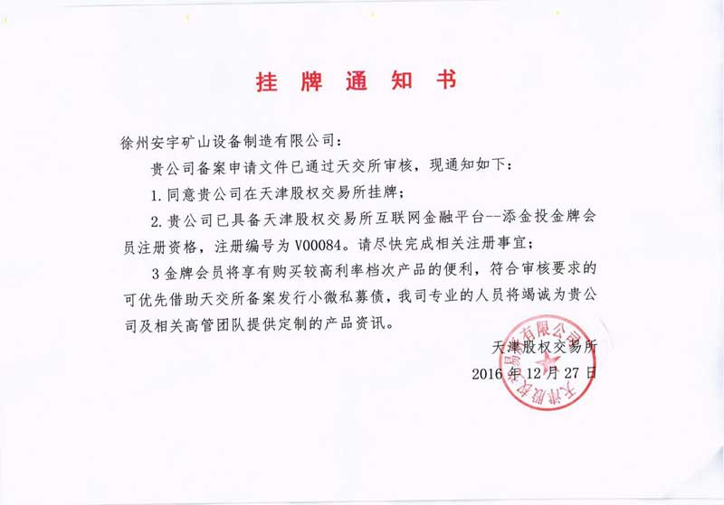 熱烈慶祝徐州安宇礦山設(shè)備制造有限公司(以下簡(jiǎn)稱:徐州安宇),于2016年12月30日,備案申請(qǐng)文件已通過(guò)天交所審核,成功在天津股權(quán)交易所掛牌,我公司已具備天津股權(quán)交易所互聯(lián)網(wǎng)金融平臺(tái)—添金投金牌會(huì)員注冊(cè)資格,注冊(cè)編號(hào)為V00084。(徐州安宇股權(quán)交易代碼:300280)。