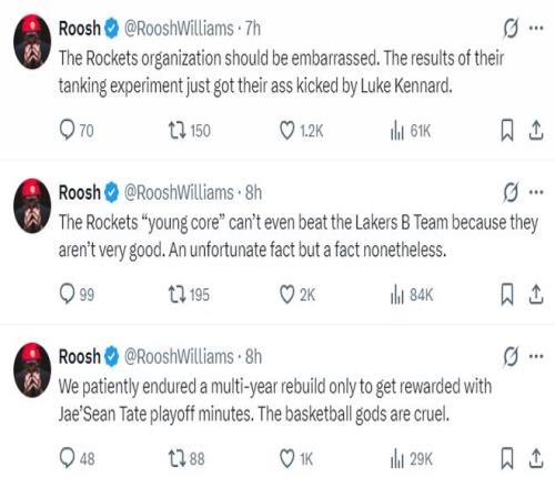休媒Roosh繼續(xù)開噴:火箭隊管理層應(yīng)該感到羞愧不堪,他們‘拼命掙扎’策略的實(shí)驗(yàn)結(jié)果竟然被肯納德打得一敗涂地?;鸺哪贻p核心們甚至連湖人二隊都打不贏,因?yàn)樗麄冇矊?shí)力實(shí)在是太差了,這是一個遺憾的事實(shí),但卻是事實(shí)。