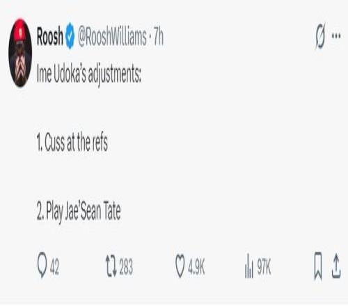 休媒Roosh寫道:這就是烏度卡的調(diào)整,1.對著裁判罵罵咧咧;2.重用杰肖恩-泰特。