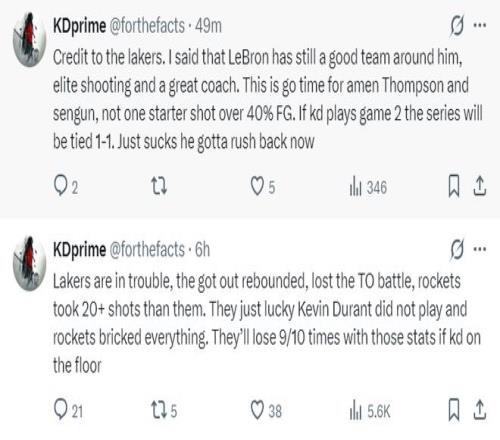 休媒:火箭隊的籃板球比湖人多20+,火箭隊就輸在沒有杜蘭特,他們有太多輕松的投籃機(jī)會未能命中,如果杜蘭特能登場的話,湖人十有八九會輸球。