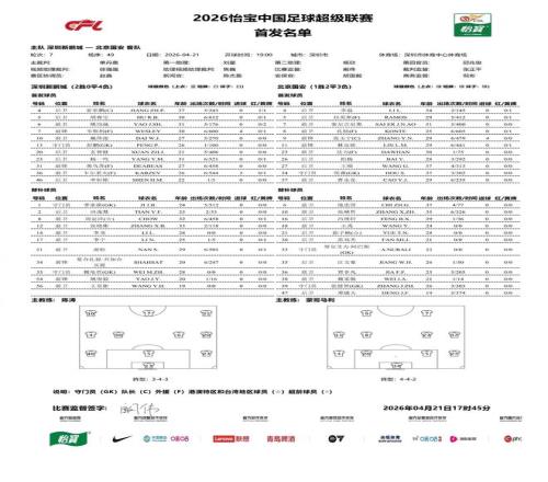 北京時間4月21日19:00,中超第7輪展開爭奪,深圳新鵬城坐鎮(zhèn)深圳市體育中心體育場迎戰(zhàn)北京國安,本場主裁判為單丹奧,VAR裁判為徐強強,賽前雙方首發(fā)出爐。