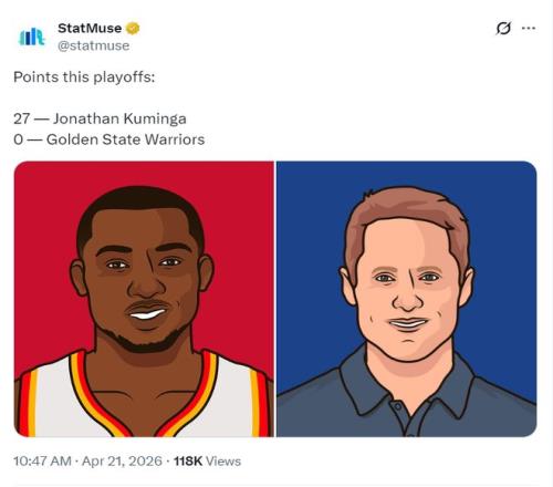 賽后美媒SataMuse曬出,庫明加季后賽已經(jīng)27分對比勇士0分的數(shù)據(jù)扎心科爾。